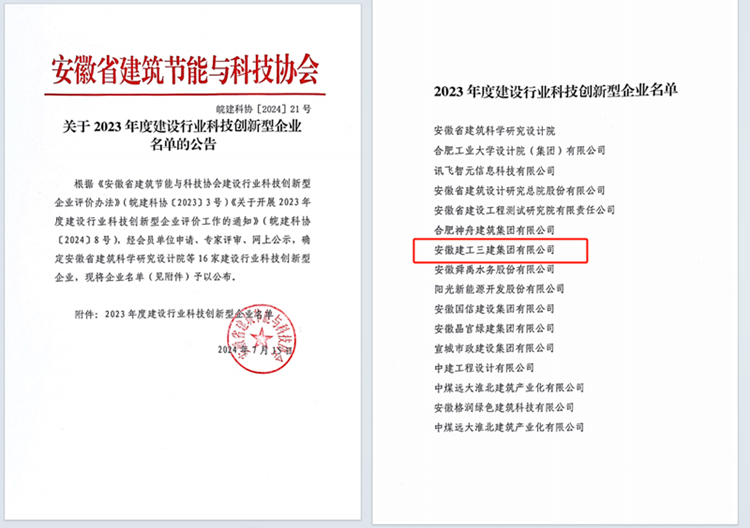 近日,安徽省建筑節(jié)能與科技協(xié)會公布“2023年度建設(shè)行業(yè)科技創(chuàng)新型企業(yè)”名單,安徽建工三建集團作為唯一一家省屬國有施工企業(yè)榮登榜單。