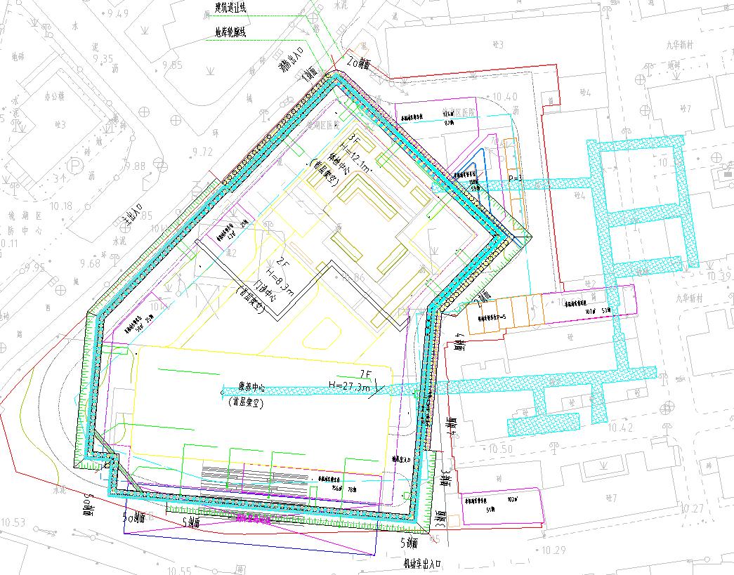 在項目場地東側(cè)支護樁施工過程中,施工人員發(fā)現(xiàn)疑似地下人防洞的跡象。建設單位立即組織勘察單位對紅線范圍內(nèi)進行詳細勘察,最終確認此處存在地下人防洞。該人防洞埋置最深達21米,孔洞高度最高為6.7米。經(jīng)與人防部門溝通了解到,人防洞大致位置已明確,且穿過項目紅線,大部分位于九華新村小區(qū)內(nèi)。為消除防空洞對天然基礎及支護樁可能產(chǎn)生的不利影響,對整個防空洞進行加固處理勢在必行。